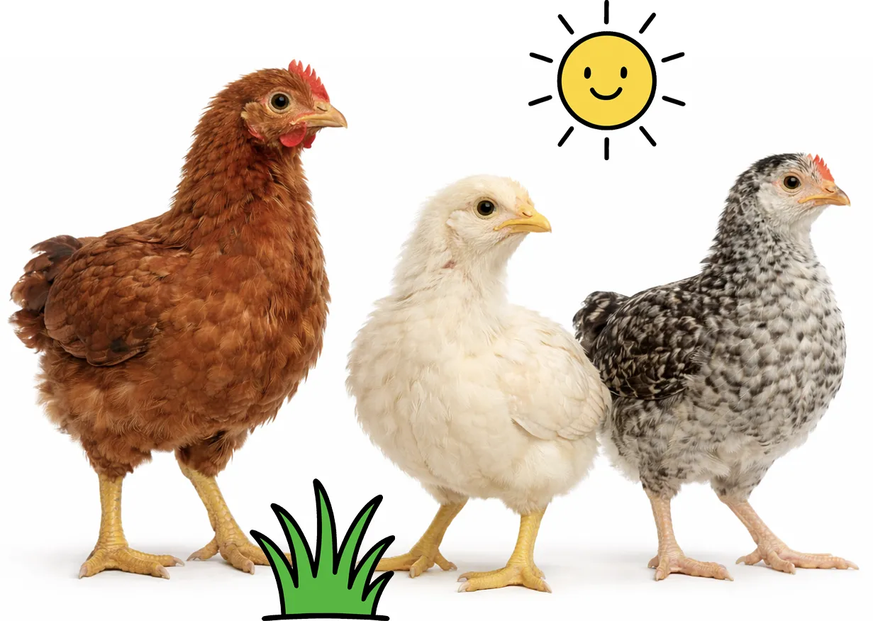 Furaje adaptate etapelor de creștere ale puilor de găină, concepute pentru susținerea unei dezvoltări echilibrate.